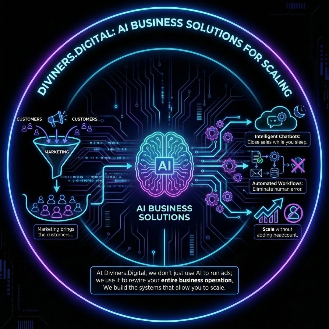 Marketing brings the customers, but AI Business Solutions ensures you can handle them. At Diviners.Digital, we don’t just use AI to run ads; we use it to rewire your entire business operation. From intelligent chatbots that close sales while you sleep to automated workflows that eliminate human error, we build the systems that allow you to scale without adding headcount