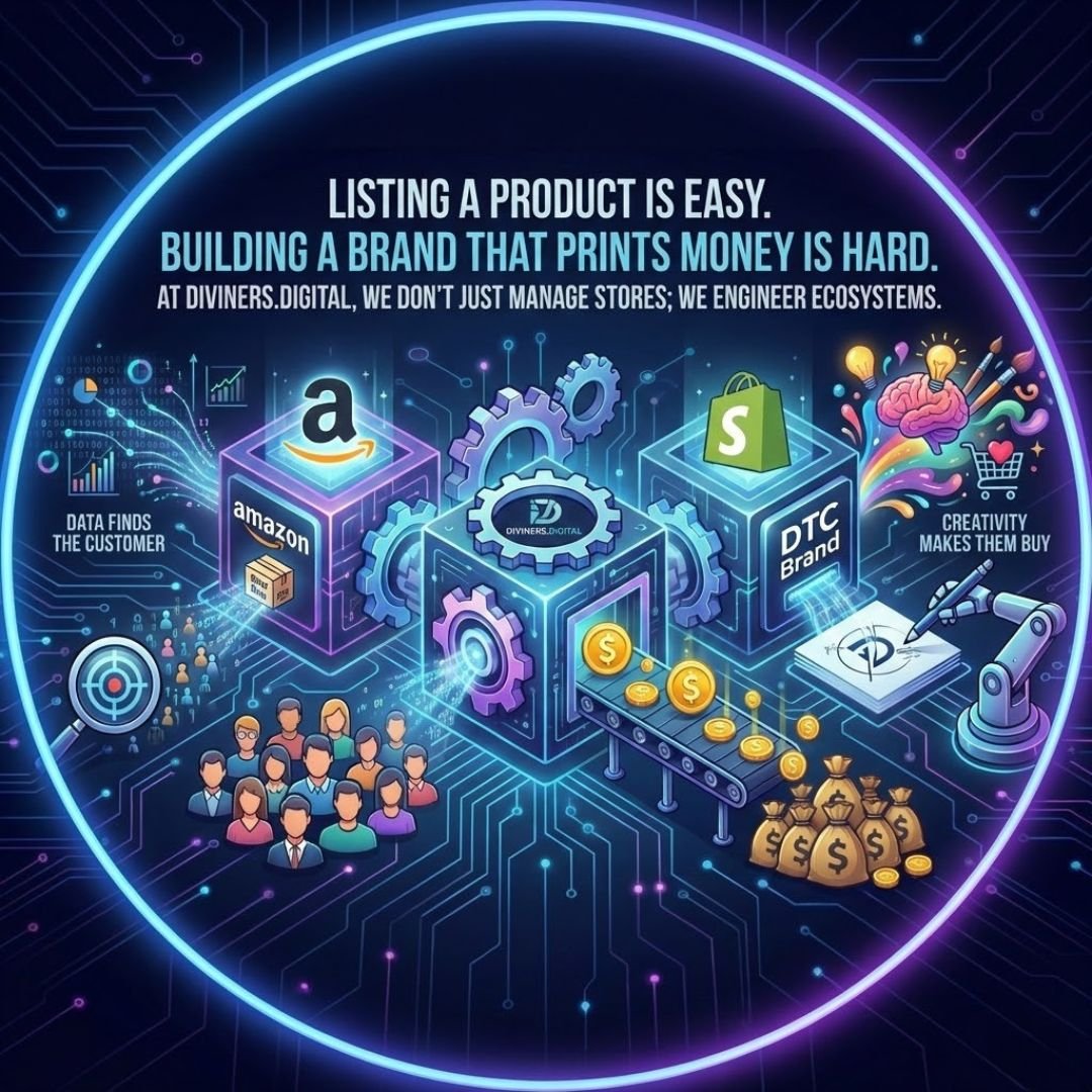 Listing a product is easy. Building a brand that prints money is hard. At Diviners.Digital, we don’t just manage stores; we engineer ecosystems. Whether you are fighting for the Buy Box on Amazon or scaling a Direct-to-Consumer (DTC) brand on Shopify, our approach is the same: Data finds the customer. Creativity makes them buy.